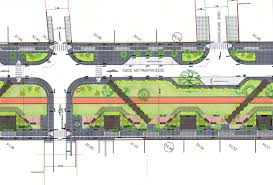 μήκους 1.670μ. και έξι πλατειών συνολικής επιφάνειας μαζί με τα γύρω πεζοδρόμια 10.900 τ.μ., που περιλαμβάνουν 5.060μ. κρασπέδων σκυροδέματος με ρείθρα, 2.065 τ.μ. επιστρώσεων με πλάκες τσιμέντου, 11.030τ.μ. επίστρωσης χυτού έγχρωμου βοτσαλωτού δαπέδου, 1.530τ.μ. επιστρώσεων με κυβόλιθους, 700τ.μ. επιστρώσεων με χονδρόπλακες ορθογωνισμένες, 10.500τ.μ. ασφαλτοστρώσεων κλπ. Στους δρόμους και τα πεζοδρόμια ενισχύεται η γραμμικότητα και δημιουργείται κατάφυτη διαδρομή περιπάτου και αναψυχής, ενώ προβλέπεται ανασχεδιασμός με δημιουργία προεξοχών και διαπλάτυνση του πεζοδρομίου προς το οδόστρωμα στις διασταυρώσεις και τακτοποίηση των παρκαρισμένων οχημάτων σε εσοχές.