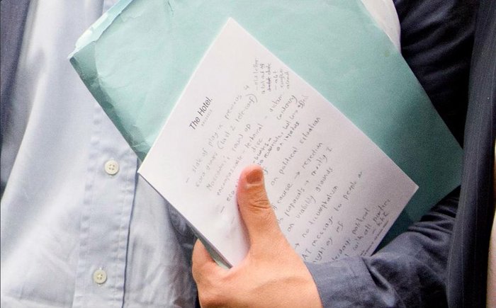 Όπως μαρτυρά και η σχετική φωτογραφία, ο κ. Τσακαλώτος έχει κρατήσει κάποιες σημειώσεις σε ένα σημειωματάριο με το διακριτικό σήμα του ξενοδοχείου στο οποίο διαμένει.